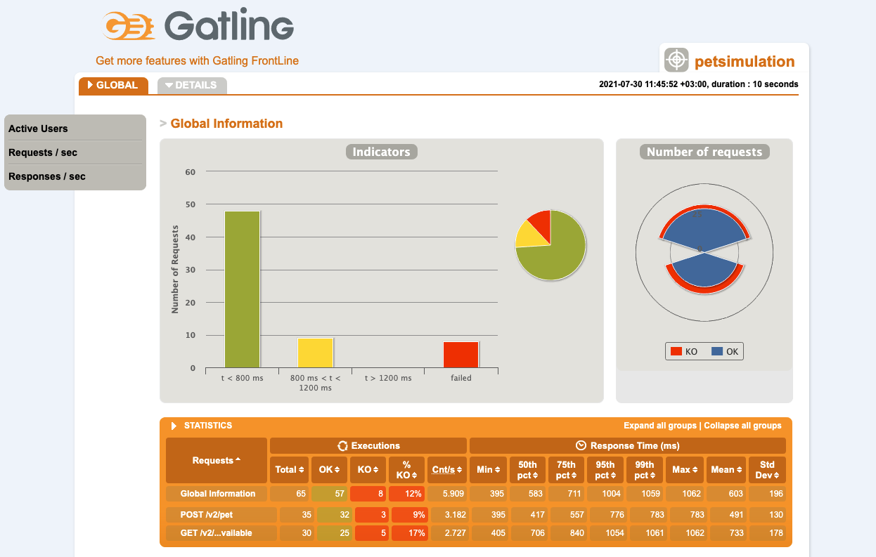 After execution, 30 users can send receive and requests within 10 seconds. Here you can try more users or more settings. These settings can vary depending on the resources of the server you are testing. After processing, Gatling will generate a report based on visual data. You can find the data of the load test in this report.